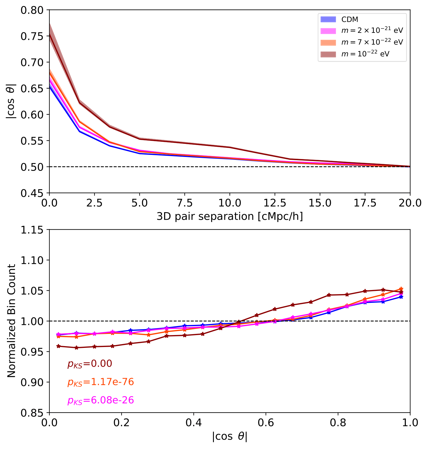 For cFDM cosmologies, Fig. 2 clearly demonstrates how the geometric alignment is gradually enhanced as the cFDM particle mass \(m\) is decreased. For our most extreme cFDM model with \(m=10^{-22}\) eV, the median \(|\cos \theta|\) curve climbs up to \(0.753^{+0.021}_{-0.010}\), the wider-spread percentiles effected by the smaller number of halos compared to CDM. The enhancement is due to the lack of small-scale structure such as smaller-mass halos that would regularise the tidal fields generated by quasi-linear cosmic filaments and to a lesser extent 2D cosmic sheets. Shape-position alignments are significantly different from the uniform random result even out to 3D pair separations of \(10\) cMpc/\(h\), where \(|\cos \theta| \sim 0.54\). Upon inspection of the \(|\cos \theta|\) distribution after marginalising over 3D pair separations, we find that the Kolmogorov-Smirnov \(p\)-value, \(p_{\text{KS}}\), for rejecting the hypothesis that the cFDM and CDM signals are drawn from the same distribution is very low. In other words, the hypothesis can be ruled out with very high significance. As expected, \(p_{\text{KS}}\) increases with \(m\).