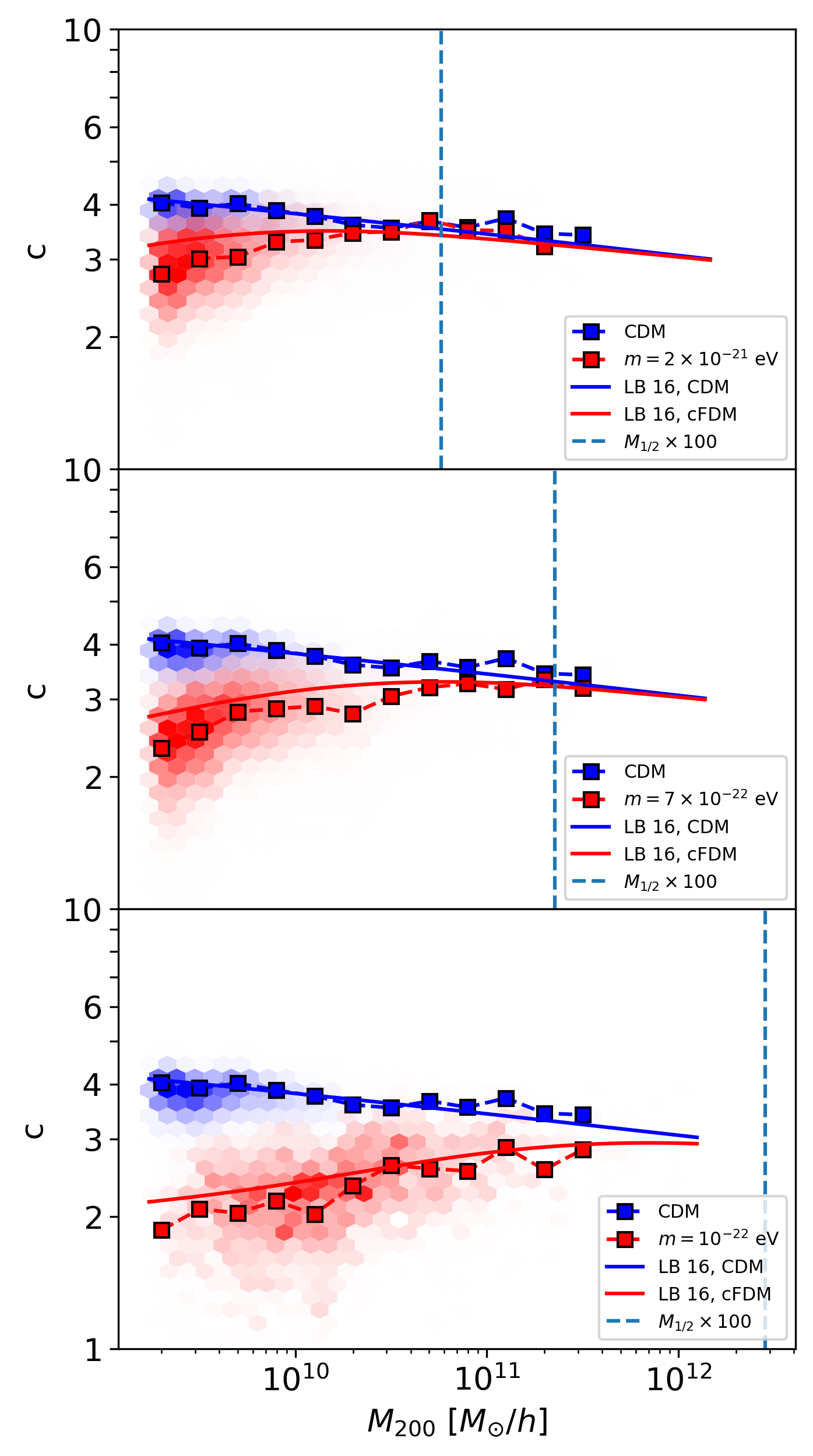 | Fig. 1: Concentration-mass relation \(c(M,z)\) in different cosmologies, for \(N\)-body, \(1024^3\) resolution, \(L_{\text{box}} = 40\) cMpc\(/h\) runs at redshift \(z=4.38\). We compare the CDM halos (blue) with cFDM halos for particle mass \(m=2\times 10^{-21}\) eV (top), \(m=7\times 10^{-22}\) eV (middle) and \(m=10^{-22}\) eV (bottom). Square markers indicate median concentrations obtained from Einasto best-fits while the color of each hexbin is proportional to the number of halos whose Einasto concentration falls therein. “LB 16, CDM” and “LB 16, cFDM” show an analytical model prediction from Ludlow et al 2016 for model parameters \(f=0.02\) and \(C=650\). |