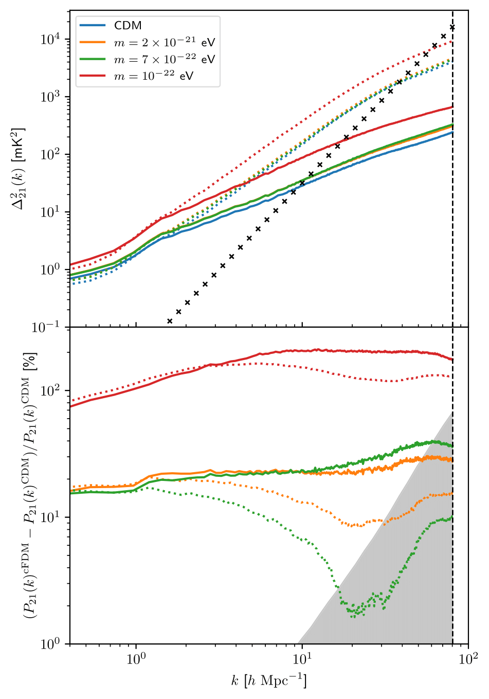 | Fig. 6: 21 cm power spectrum in CDM and cFDM cosmologies at \(z=4.94\). We show results for the “dimensionless” power spectrum \(\Delta^2_{21}(k)=k^3P_{21}(k)/(2\pi^2)\), in both real space (dotted lines) and redshift space (solid lines). Black crosses denote the expected SKA1-Low \(1\sigma\) system temperature noise \(\Delta^2_{\text{noise}}\) for \(1080\) hours of observation in a \(8\) MHz bandwidth with \(290\) frequency channels as per Table 1, for an optimistic foreground wedge model. The vertical dashed line denotes the Nyquist frequency \(k_{\text{Ny}} = \pi N^{1/3} / L_{\text{box}}\) (in black). In the bottom panel, we present the relative difference between cFDM and CDM, identical to the relative difference in the HI power spectrum, see Fig. 5. The normalized error \(\Delta^2_{\text{noise}}/\Delta^2_{21,\text{CDM}}\) on the CDM 21 cm power spectrum for the same instrument parameters in SKA1-Low is shown by a shaded region. 21 cm clustering increases for decreasing axion mass \(m\). |