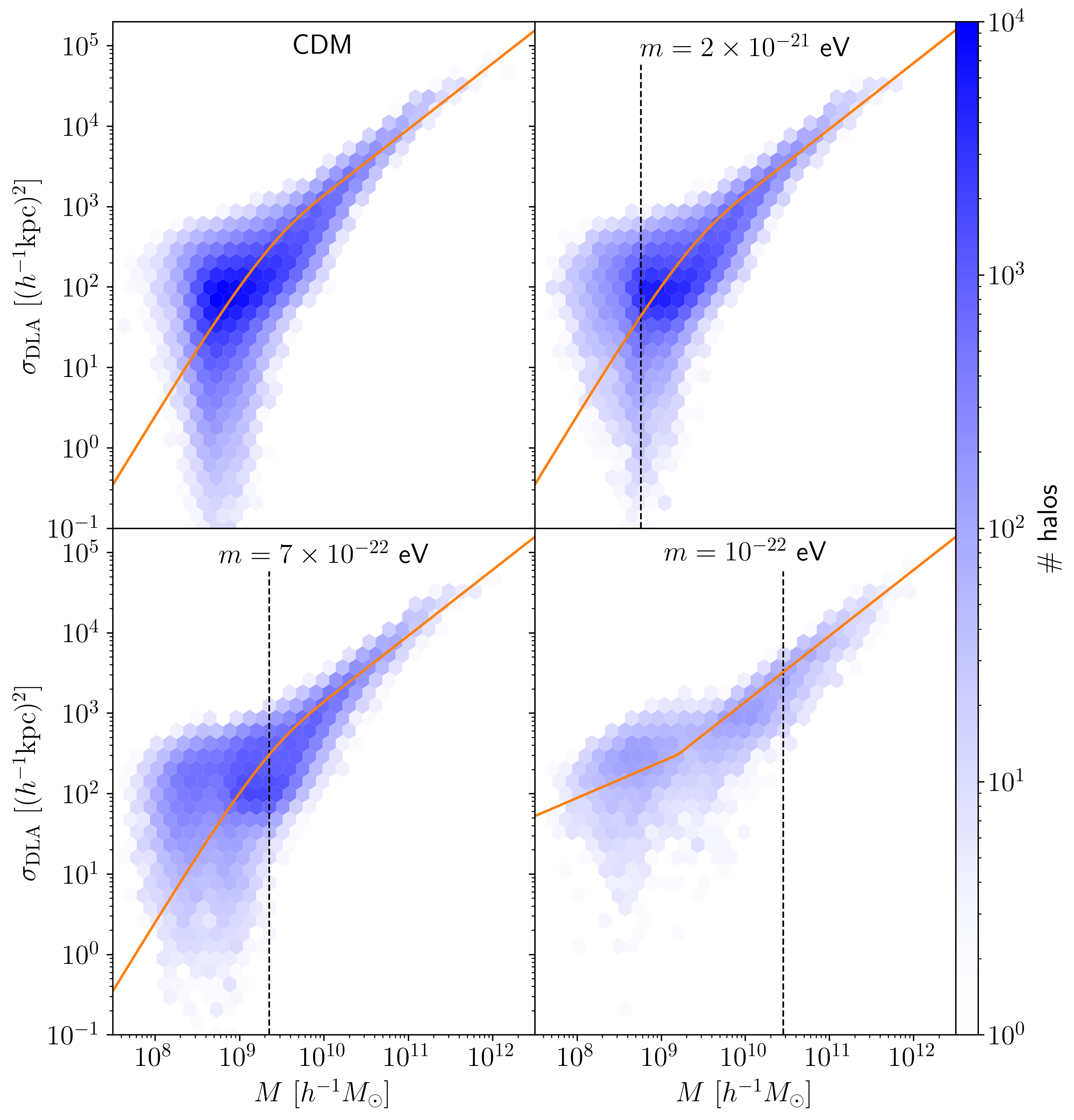 | Fig. 8: DLA cross-section of halos at \(z=4.94\). The color of each hexbin is proportional to the number of halos. For the CDM (top left), \(m=2\times 10^{-21}\) eV (top right) and \(m=7\times 10^{-22}\) eV (bottom left) cosmologies, we fit a power law + exponential function while for the \(m=10^{-22}\) eV (bottom right) cosmology we fit a double power law. The vertical dashed line denotes the half-mode mass \(M_{1/2}\) (Marsh 2016). The small secondary peak in the \(m=7\times 10^{-22}\) eV model morphs into a bimodal distribution in the \(m=10^{-22}\) eV cosmology. |