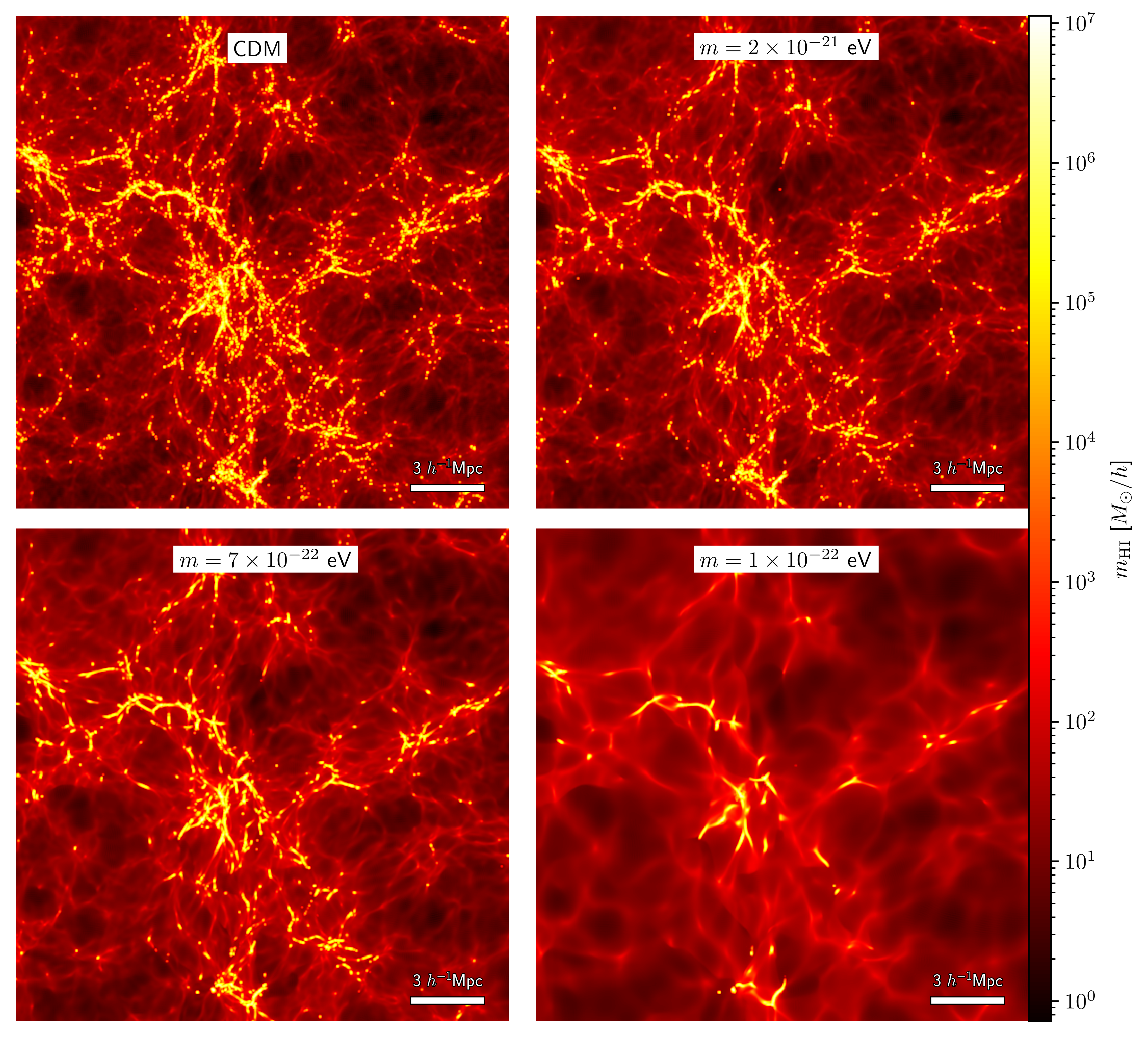 \[z=\nu_{21}/\nu - 1,\]for the observational frequency \(\nu\). We take the same slice of width \(\Delta L\) along the \(x\)-direction from the four hydrodynamic snapshots at \(z=4.94\), PCS-paint the HI particle data onto a 3D grid (Hand et al. 2018)), and project along the \(x\)-direction. We see how small-scale structure is visibly suppressed as the axion mass \(m\) is reduced from infinity (CDM, top left) down to \(m = 10^{-22}\) eV (bottom right).