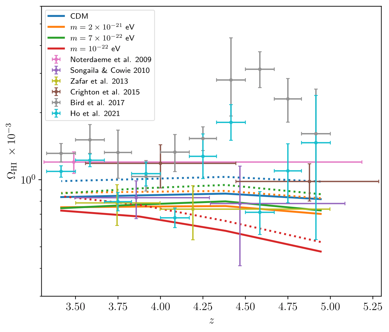 The inferred frequency distribution of HI column densities in CDM and cFDM cosmologies is shown in Fig. 7. We assume a weak redshift dependence of the HI column distribution in the range \(z=2-4\), which can be understood in the modeling framework of Theuns (2021) based on cosmological accretion of gas onto DM halos. Hence, we can overlay results from observations at redshifts \(z=[1.5-4.0]\). Since the (sub-)DLAs at \(z>4\) are rare and typically inferred from noisy spectra, they mostly contribute to enlarged error bars and we can extend the redshift range to \(z=[1.5-5.0]\). We thus add various measurements with errorbars to Fig. 7. As shown in the most recent measurement paper (Ho et al. 2021), the trend beyond \(z>4\) is in fact still unclear due to statistical uncertainties in the measurements. To better align with the observations, the results in the CDM and cFDM models are shown at \(z=3.42\) rather than \(z=4.94\) as for the bulk of this paper.