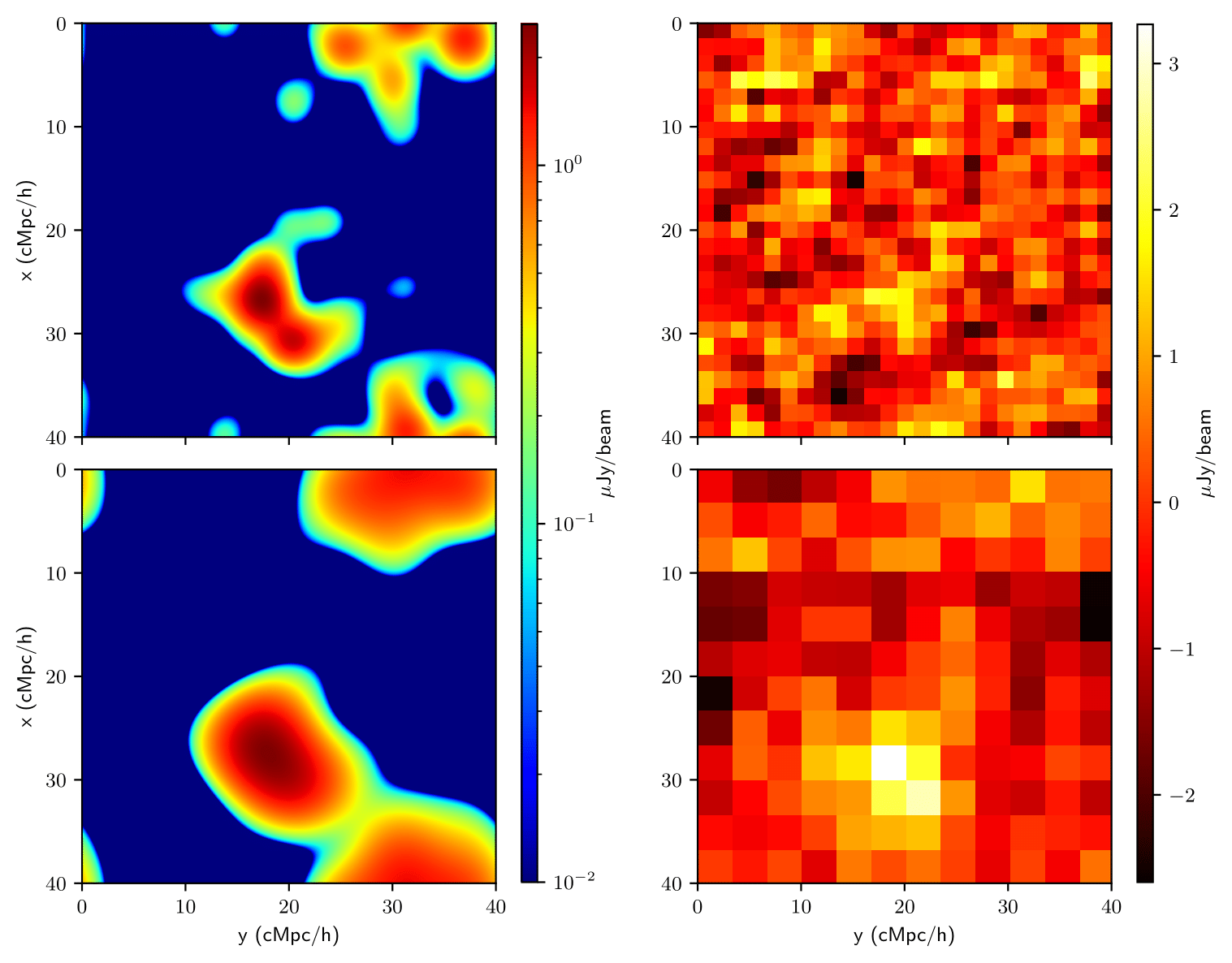 | Fig. 9: Mock radio maps for CDM with a frequency channel of width \(\Delta \nu = 272\) kHz and synthesized beam FWHM \(\theta_{A} = 1^{\prime}\) (top row) and \(\theta_{A} = 2^{\prime}\) (bottom row). Left column: Specific intensity field \(I_{\nu}(\hat{\mathbf{r}})\) for \(N_{\text{pix}} = 1024\) corresponding to our simulation resolution. Right column: Specific intensity field overlaid with instrumental noise for \(N_{\text{pix}} = 12\) and \(N_{\text{pix}} = 25\), respectively. We construct the noise map following a four-step procedure. |