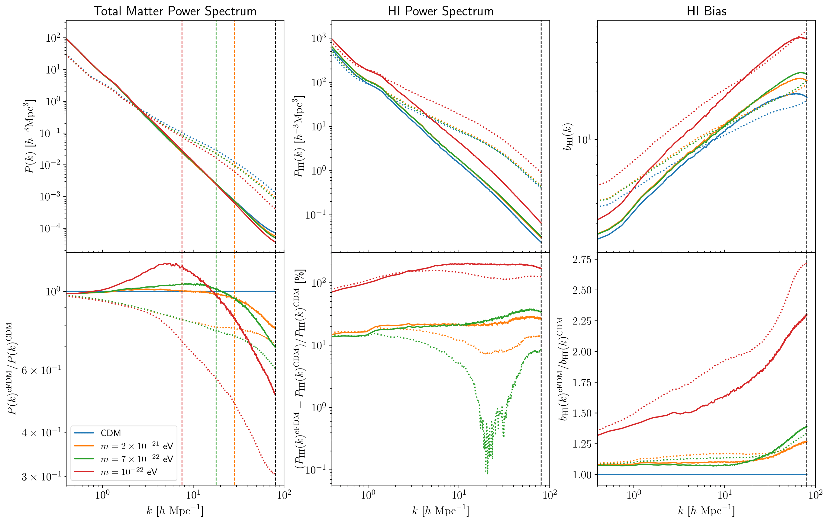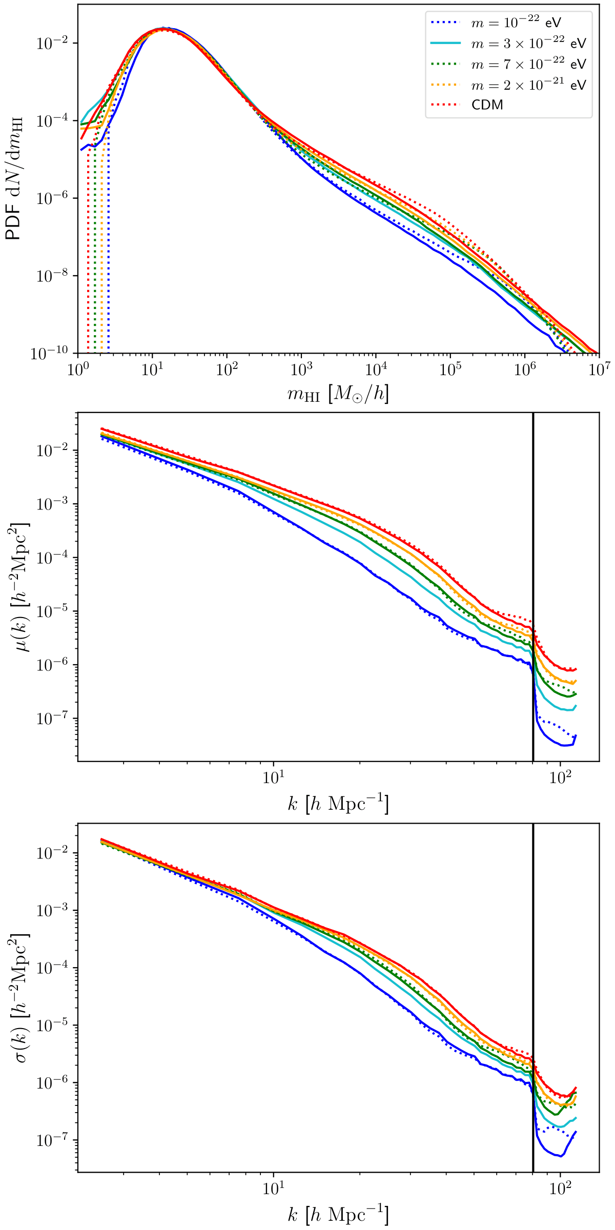 - We show that the HI frequency distribution \(f_{\text{HI}}(N_{\text{HI}}, X)\) decreases in cFDM cosmologies compared to CDM. Its weak dependence on redshift in the post-reionization era allows to compare to a range of DLA and sub-DLA observations covering a wide redshift range. They show very good agreement with predictions from CDM and the less extreme cFDM models \(m\sim 10^{-21}\) eV, with tensions appearing for the \(m=10^{-22}\) eV model.